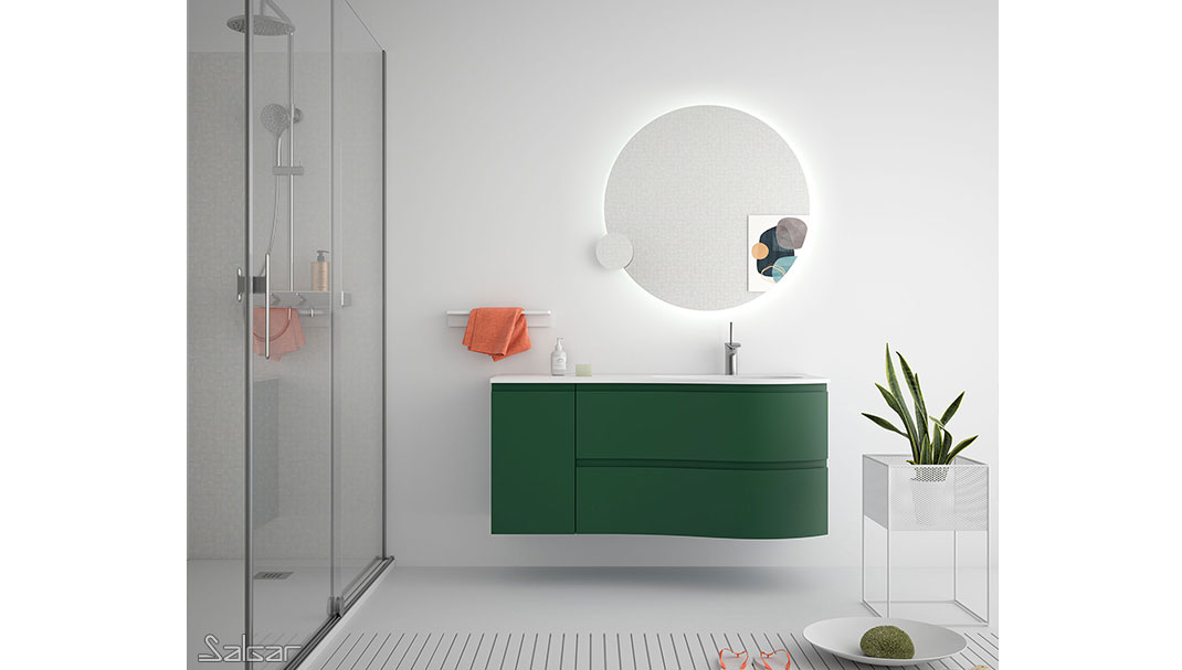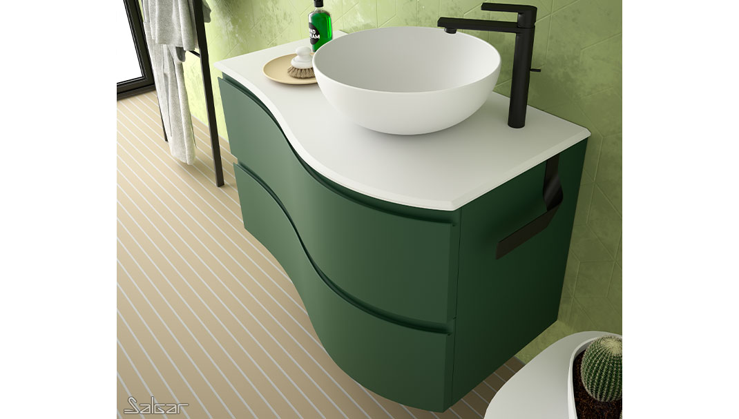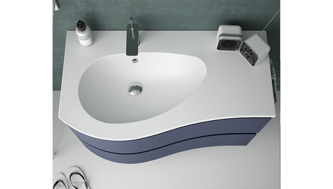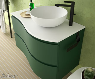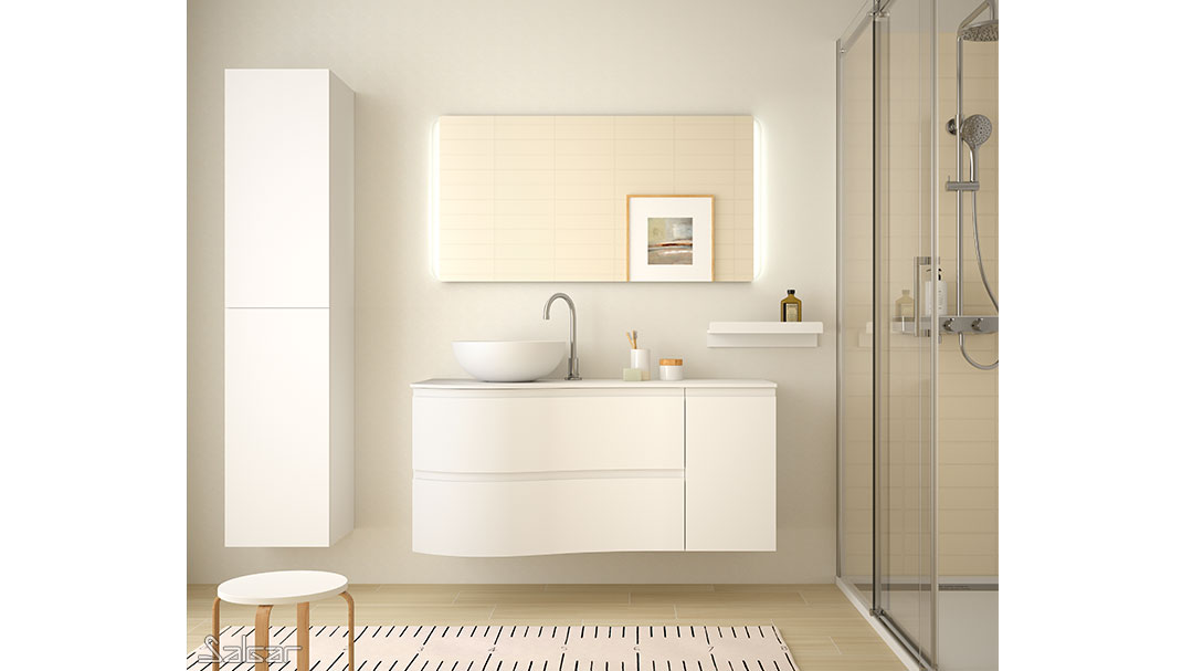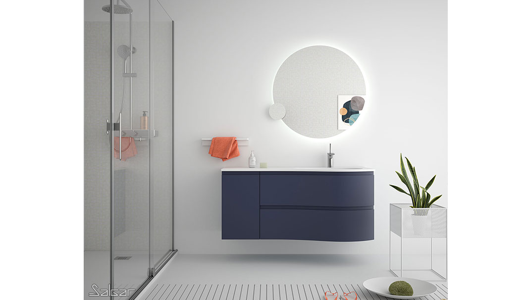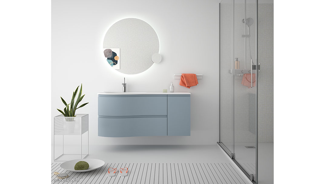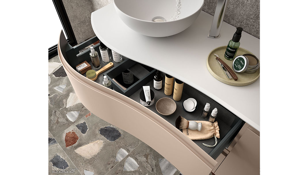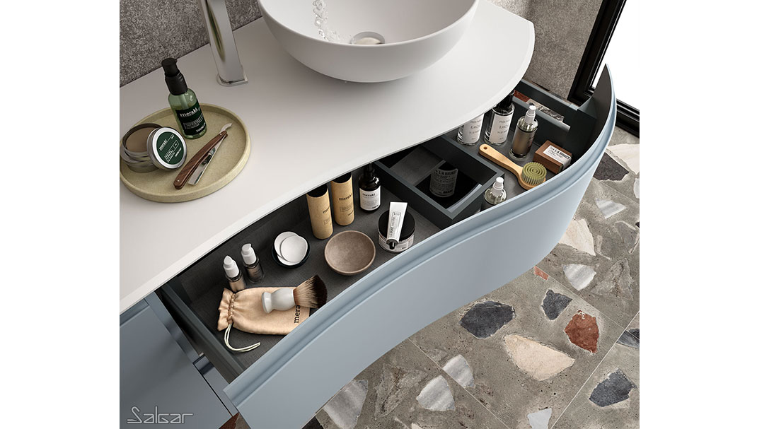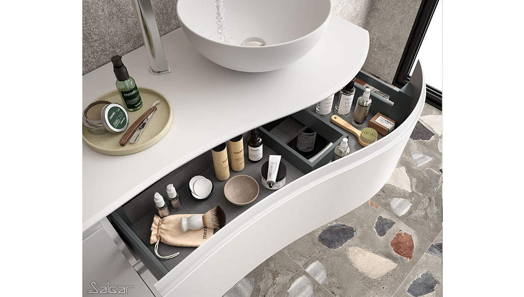 Les tiroirs métalliques haute performance ont de magnifiques façades au design courbé. Il y a une grande ergonomie dans cette série conçue pour que deux personnes puissent partager la salle de bains avec tout le confort nécessaire.